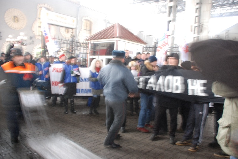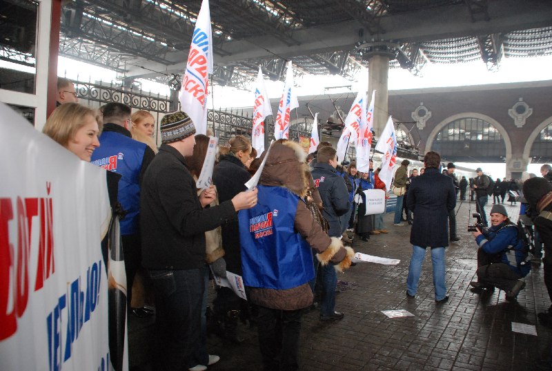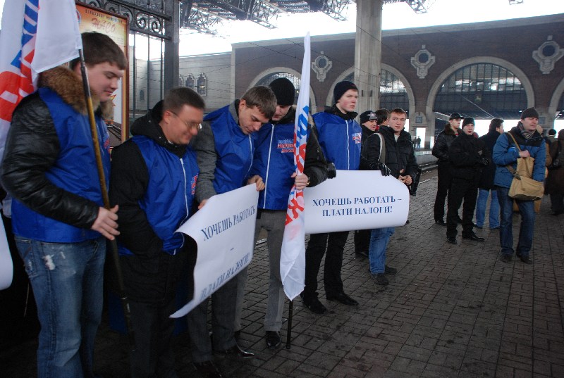 Около 40 молодых людей, одетых в куртки и жилетки "Молодой гвардии", держали флаги движения и плакаты: "Работай легально!", "Нелегал = вор", "Хочешь работать? Плати налоги!", переведенными на киргизский язык. Те же самые лозунги "молодогвардейцы" скандировали, когда из поезда "Ташкент-Москва" выходили пассажиры. Активисты раздавали им листовки, где были перечислены все управления ФМС России по Москве и приведена памятка ФМС для лиц, прибывших в Россию.
