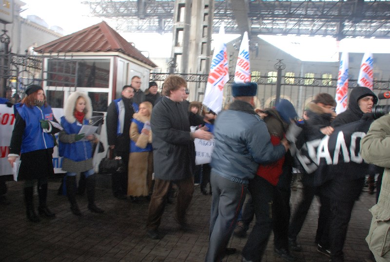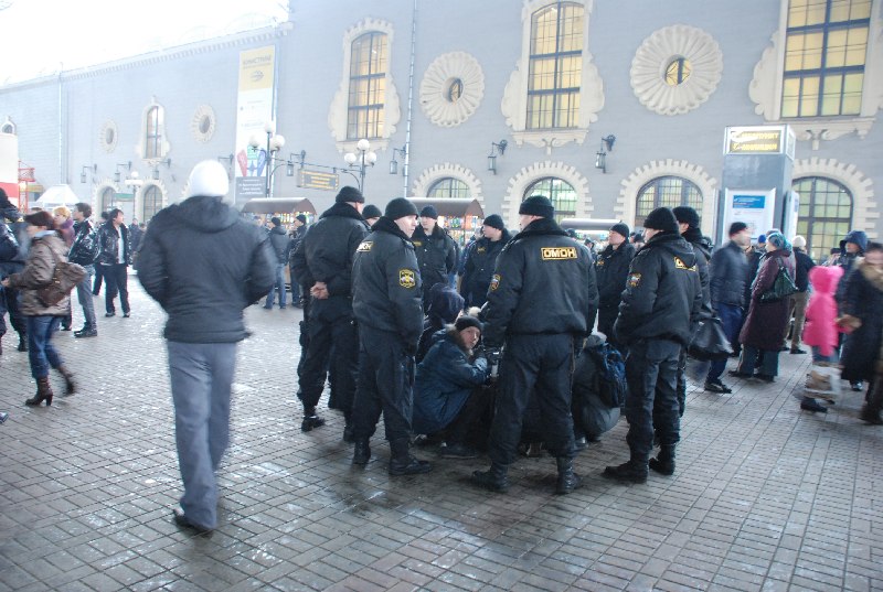 Однако спустя 5 минут активисты движения "Автономное действие" и анархисты Москвы были задержаны милицией и охранниками вокзала. На протяжение времени проведения акции "Молодой гвардии" анархисты удерживались на вокзале в оцеплении ОМОНа, позже они были выведены с территории Казанского вокзала.