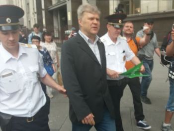 Политик ответил, что реализует свое конституционное право, однако у него отняли плакат и задержали. Его доставят в ОВД "Тверское".