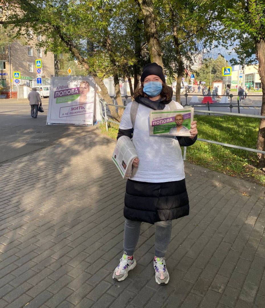 Наткнулись мы на него довольно быстро — он стоял у другого входа в метро. Девушка, раздававшая листовки, рассказала, что тоже агитирует по любви. Она давно следит за деятельностью Поповой и, когда узнала, что та идет в Госдуму, решила ее поддержать. Сказала, что волонтёрила бы и так, но подзаработать тоже хорошо.